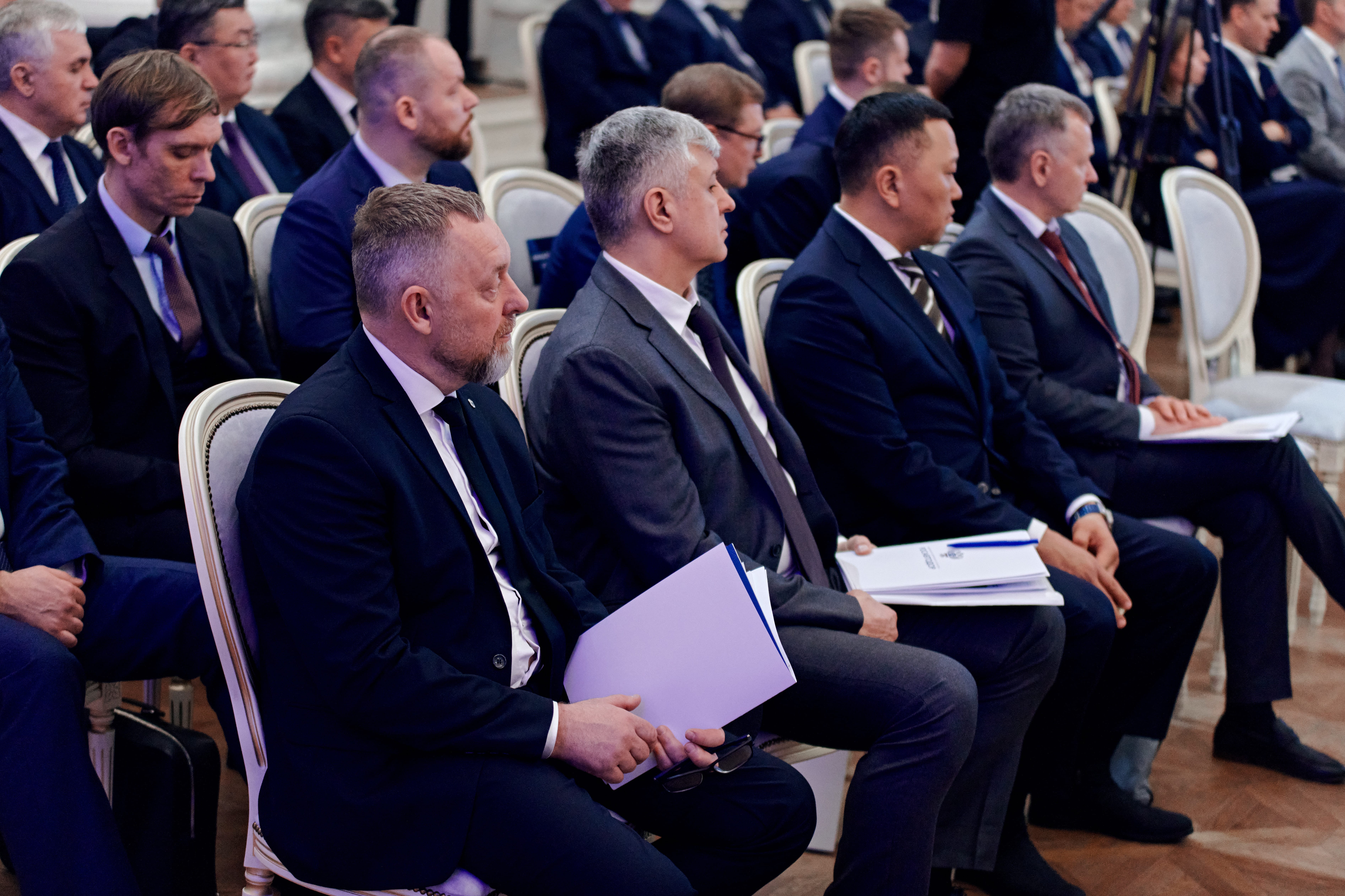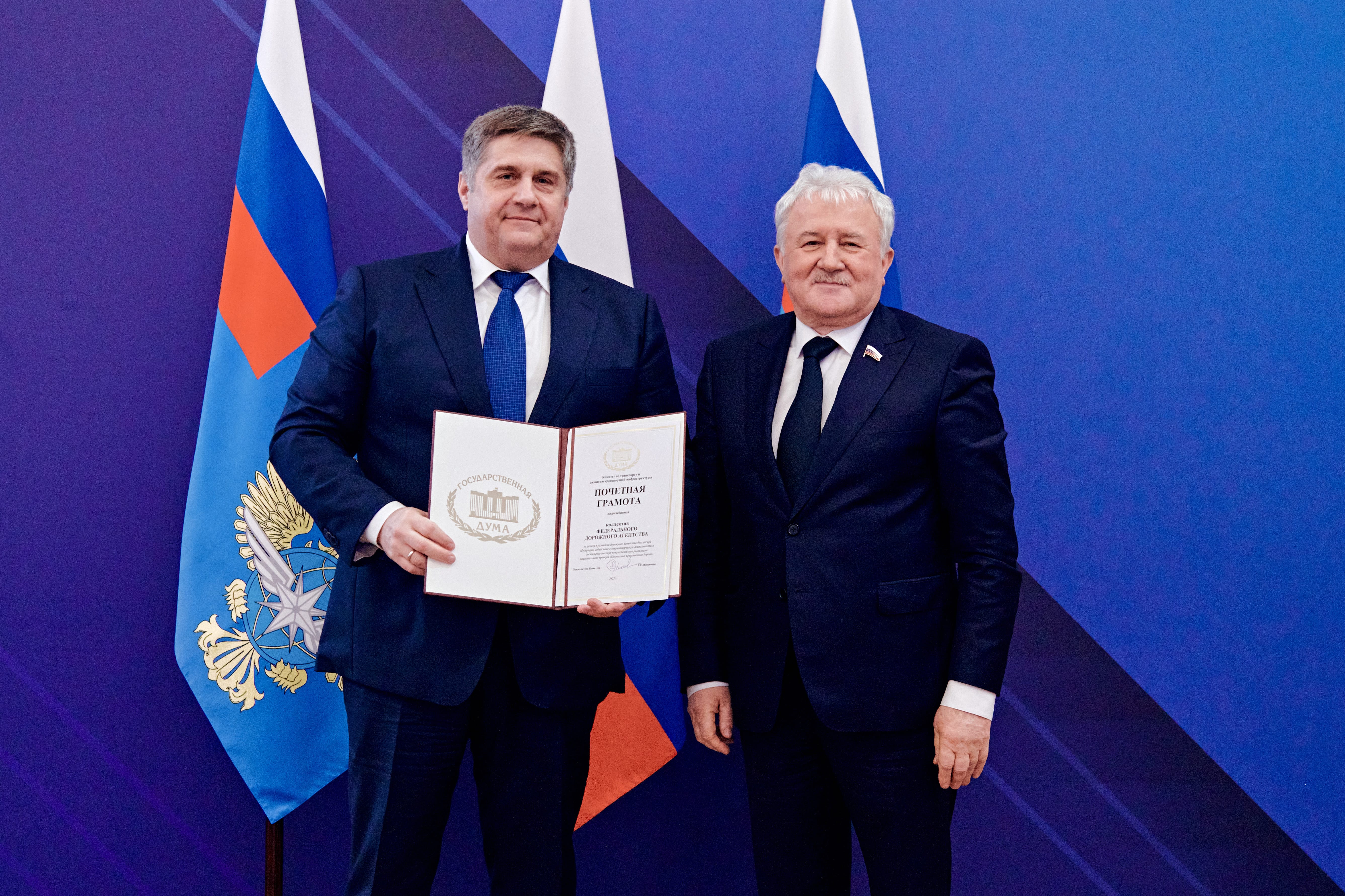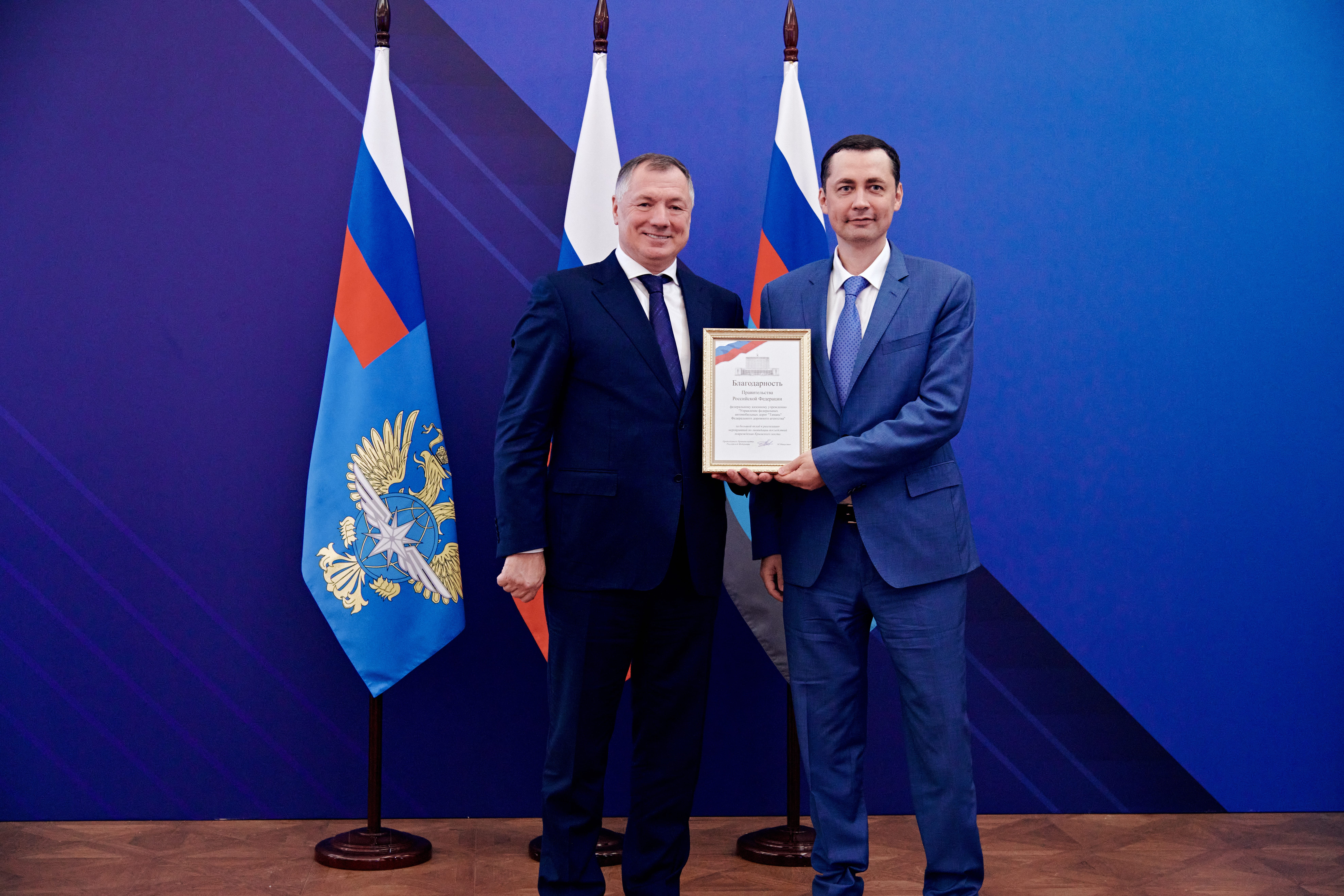 В ходе заседания Марат Хуснуллин и Роман Старовойт вручили ведомственные и государственные награды отличившимся сотрудникам дорожно-транспортного комплекса РФ.