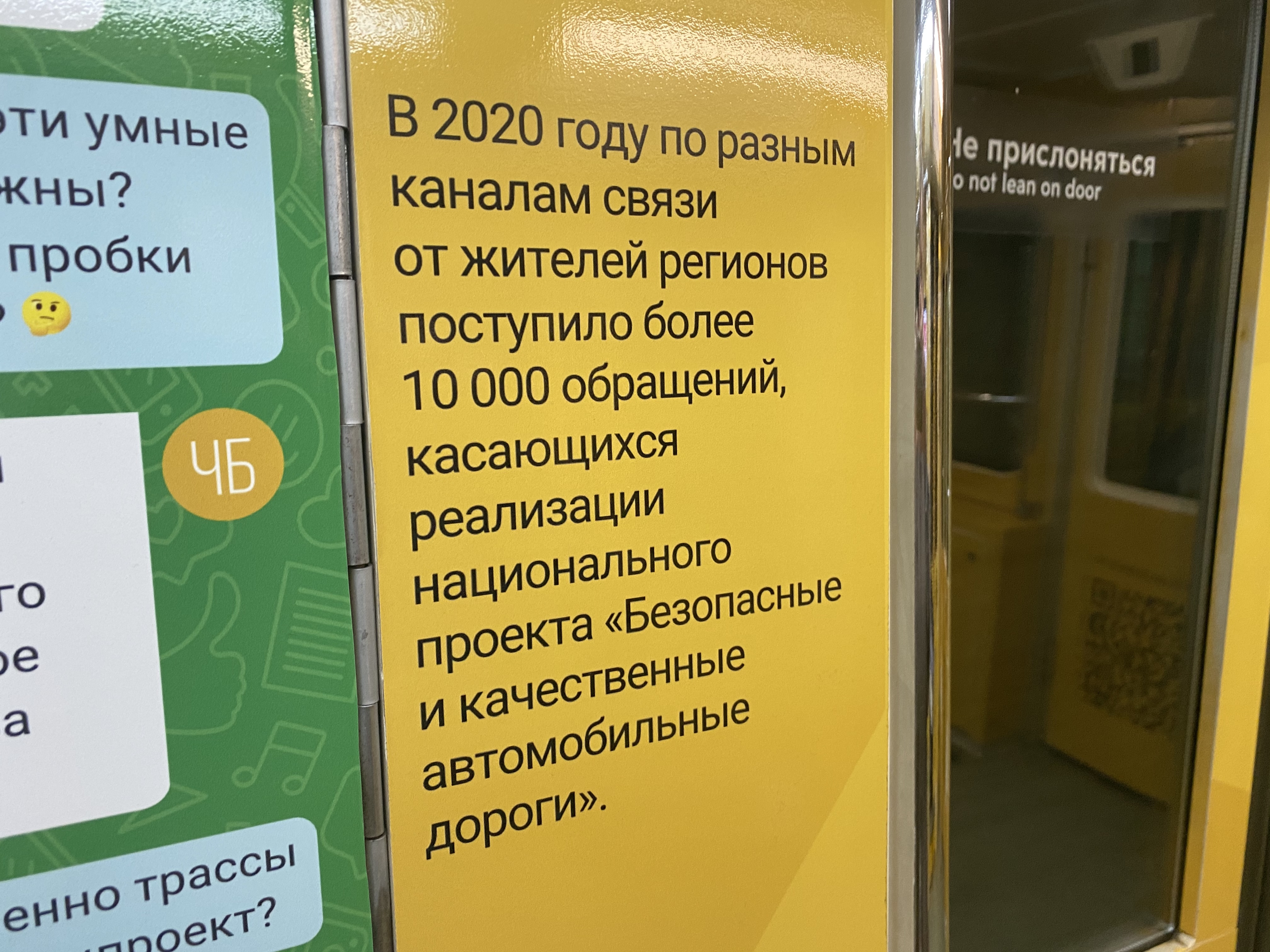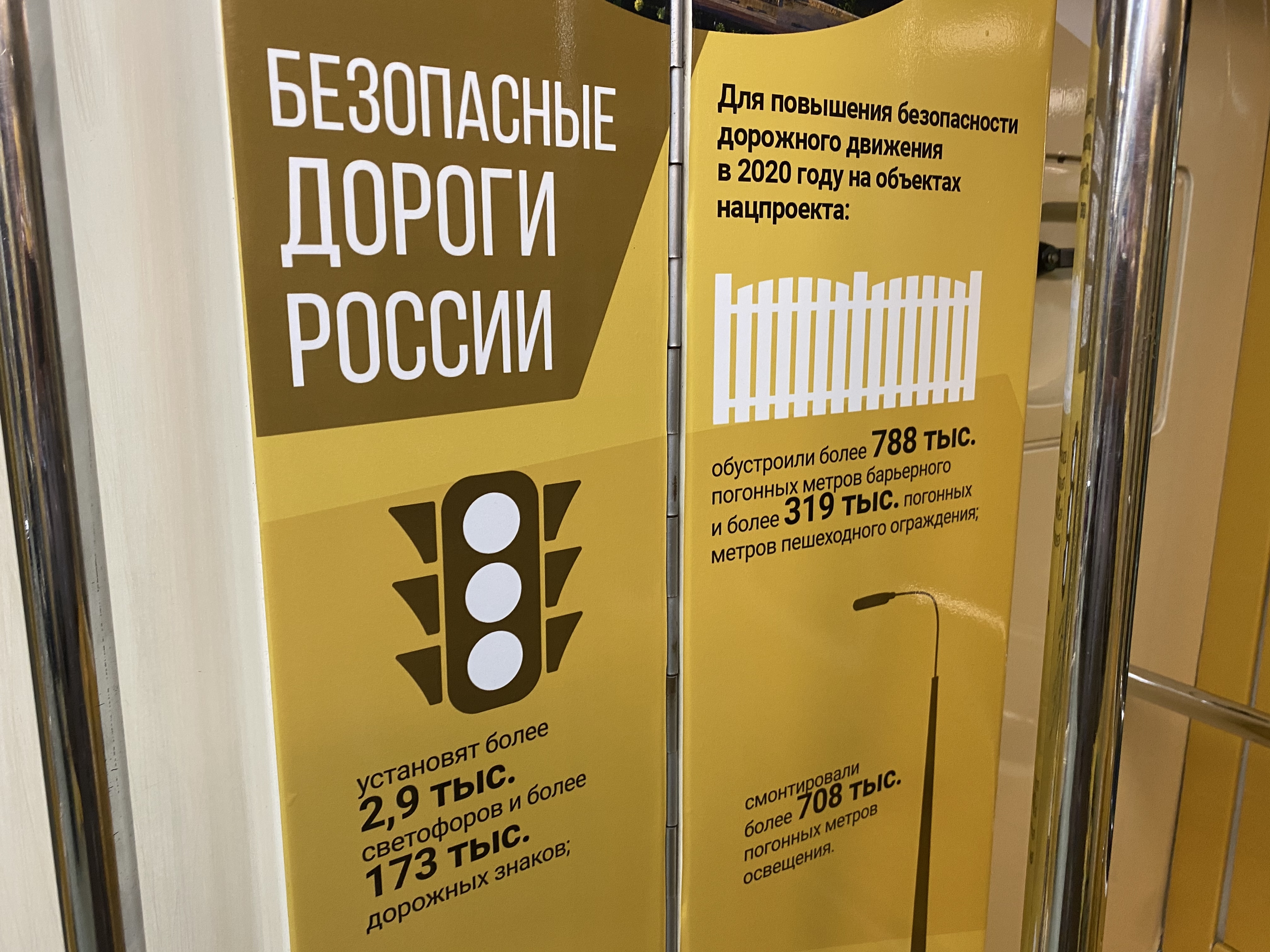 В частности, пассажиры могут ознакомиться с информацией о национальном проекте «Безопасные качественные дороги». На стенах желтого вагона размещены подробные сведения об итогах работ, проведенных в 2020 году в 83 регионах страны.