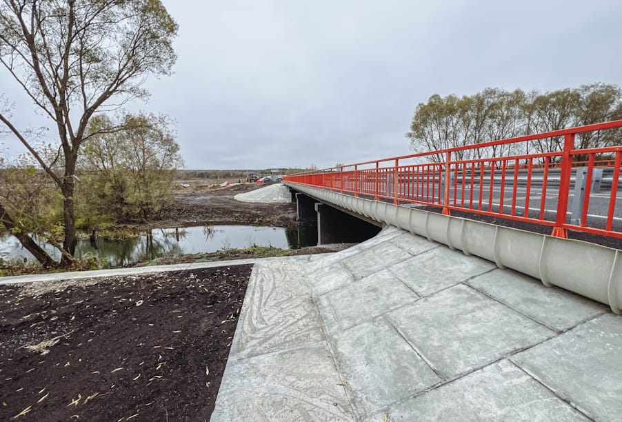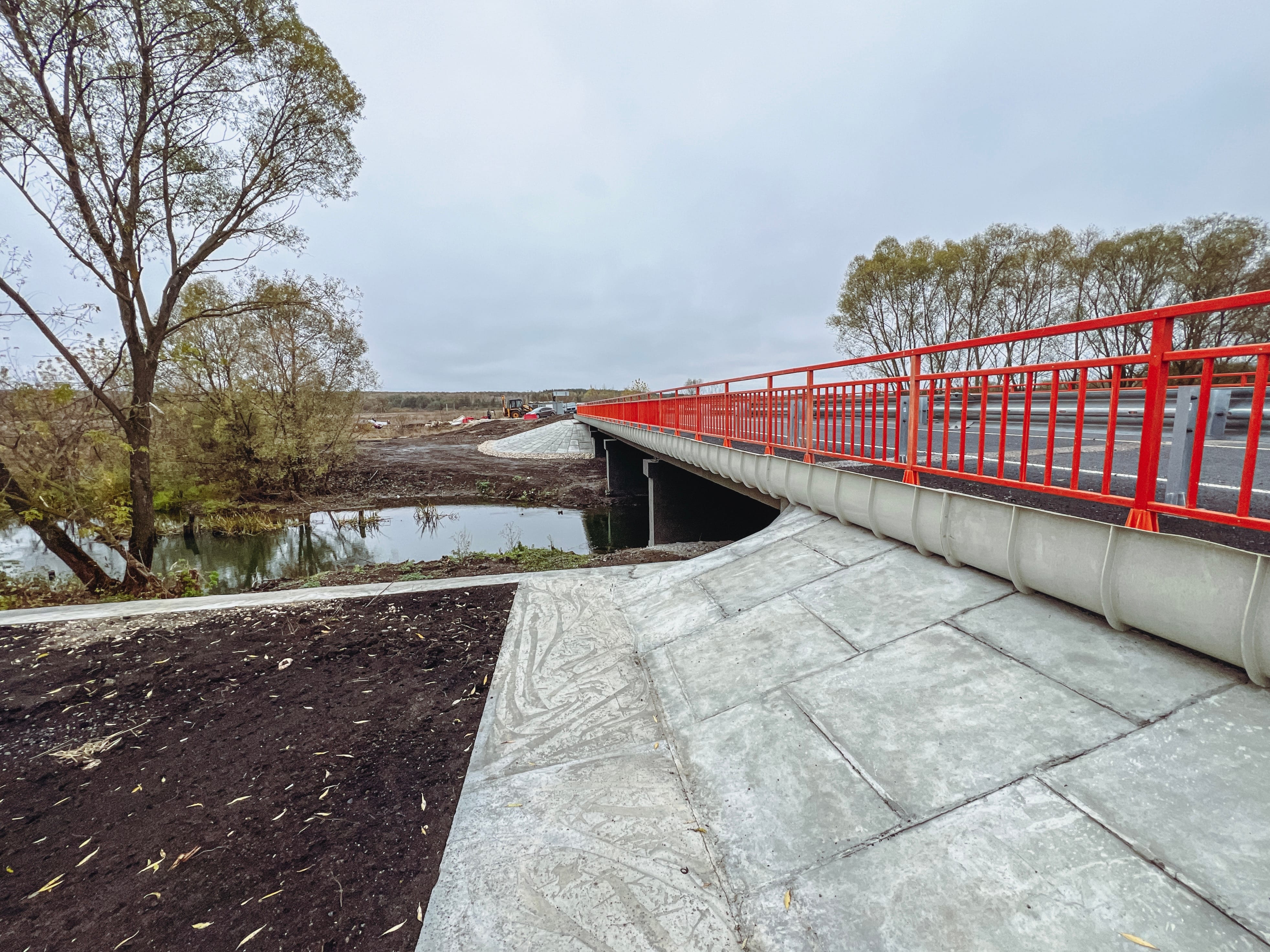 В ходе работ специалисты подрядной организации выполнили демонтаж изношенных конструкций моста, отремонтировали балки пролетного строения и русловые опоры, смонтировали новые мостовые плиты, а также устроили очистные сооружения и гидроизоляцию. Затем на объекте уложили новое дорожное покрытие, нанесли разметку, установили дорожные знаки, барьерное и перильное ограждение.